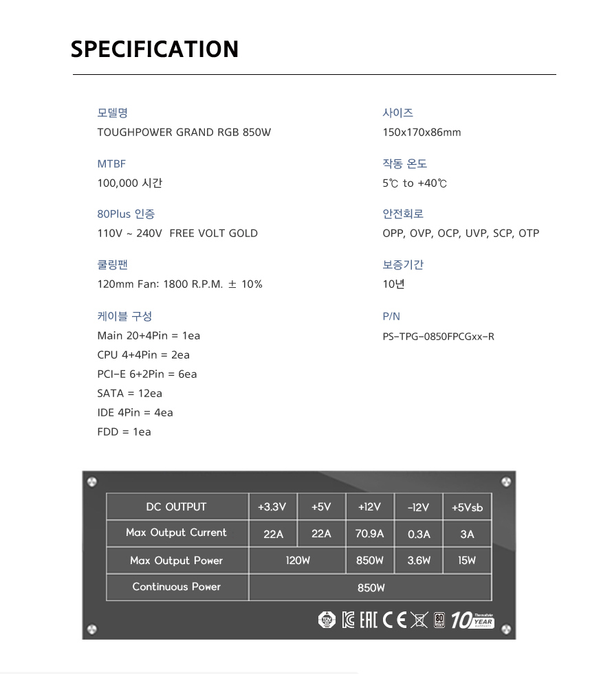 터프파워 그랜드 RGB 850W 골드 풀 모듈러