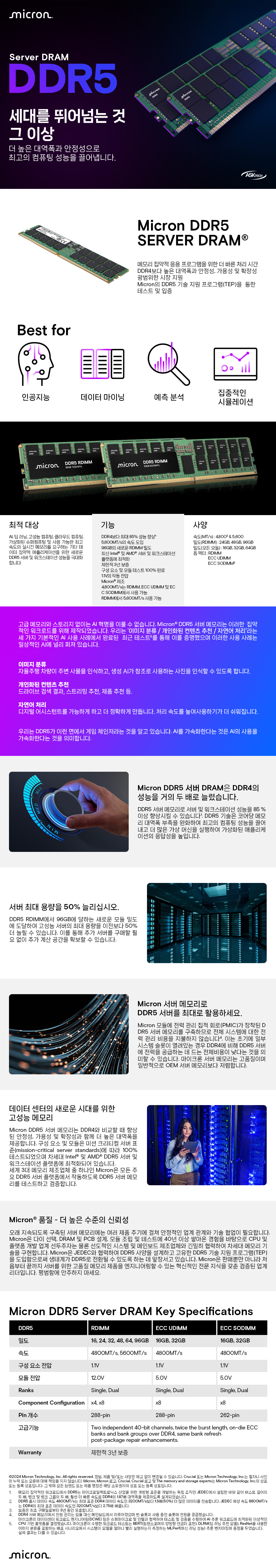 | MTC40F2046S1RC48BR | DDR5 RDIMM 64GB 2Rx4 4800 CL40 (16Gbit) (Single Pack) | |